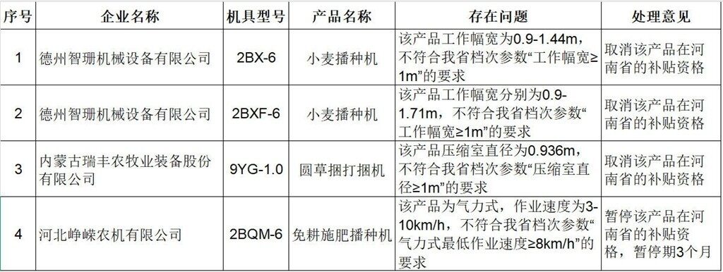 取消德州智珊机械设备有限公司2BX-6、2BXF-6小麦播种机、内蒙古瑞丰农牧业装备股份有限公司9YG-1.0圆草捆打捆机在河南省的补贴资格;暂停河北峥嵘农机有限公司2BQM-6免耕施肥播种机在河南省的补贴资格,暂停期3个月,自本通报发布之日起执行。暂停期间,河北峥嵘农机有限公司应按规定进行整改。暂停期满且完成整改后,可书面申请恢复农机购置补贴资格。