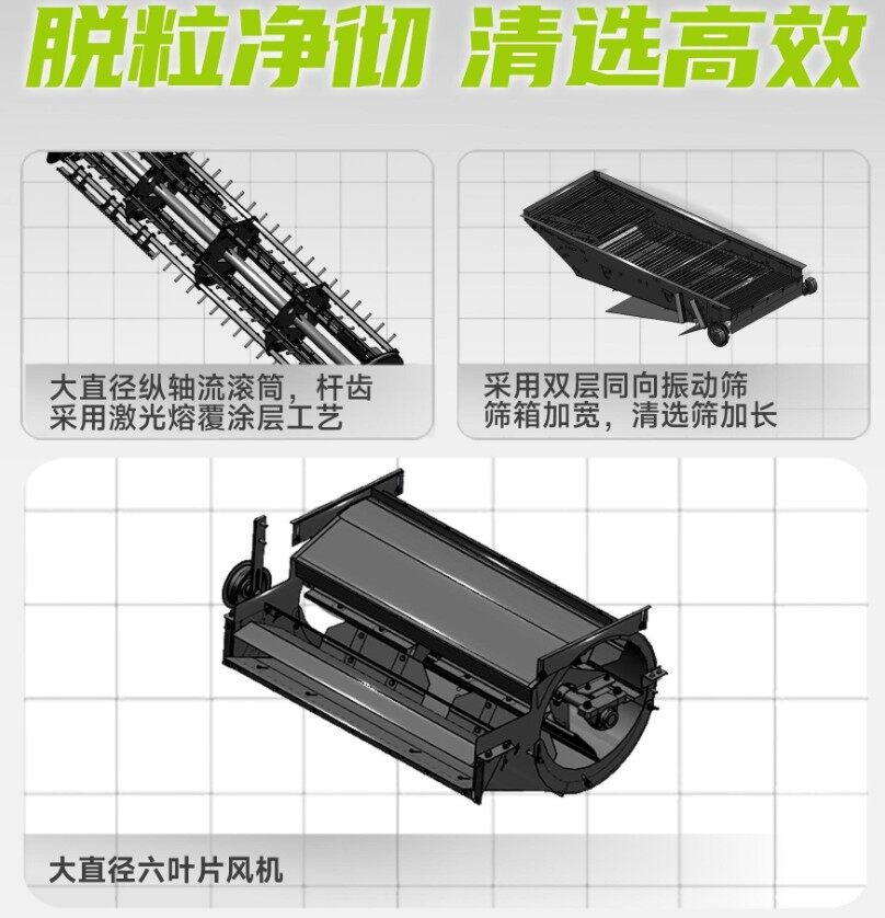 1、滚筒凹板6档可调,加强栅条凹板,可靠耐用。选装玉米圆钢凹板,收获玉米破碎低;选装冲孔凹板,收获小麦秸秆长;2、可搭载2.96米/3.25米小麦刚台、5行560行距玉米籽粒割台、7行410多功能割台,适应性广,可以实现不同作物收割。