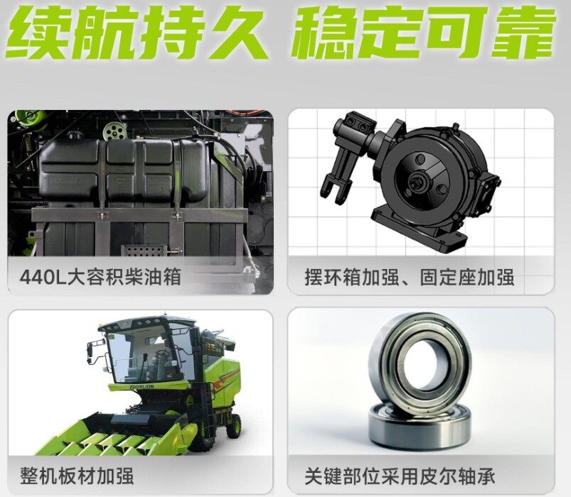 1、关键部位轴承采用进口皮尔免维护轴承,可靠性更高;2、喂入搅龙壁厚加厚并升级材质,可靠性提升80%;3、驱动轮、转向轮标配加宽子午线轮胎,接地面积更大,不陷车,作业更省油;